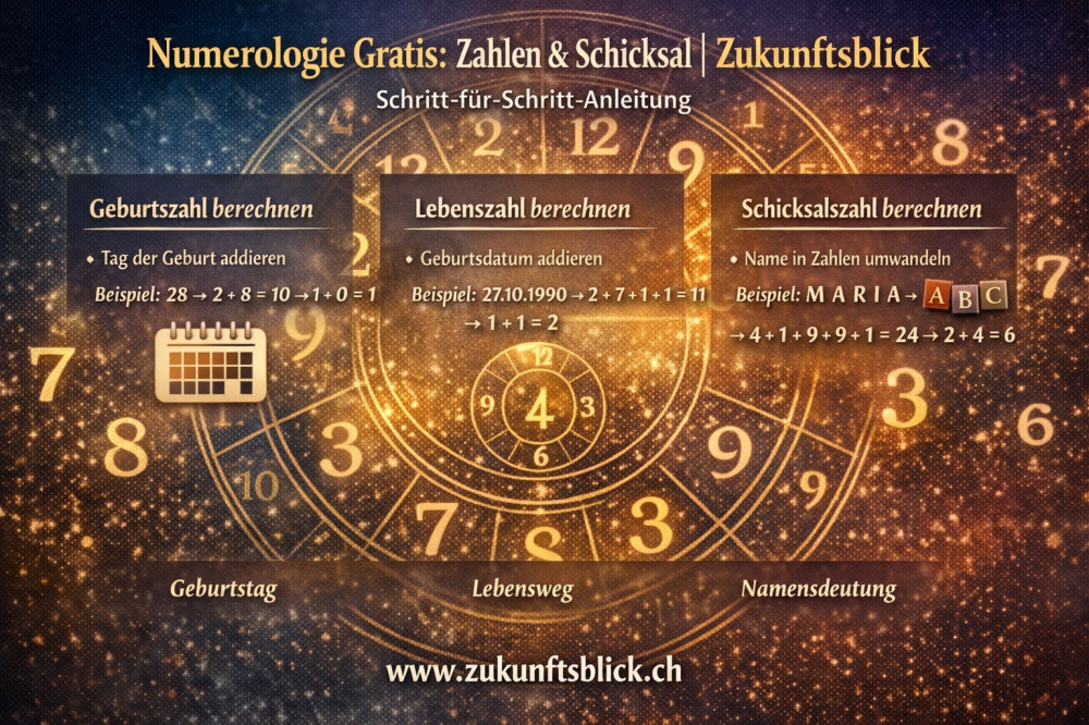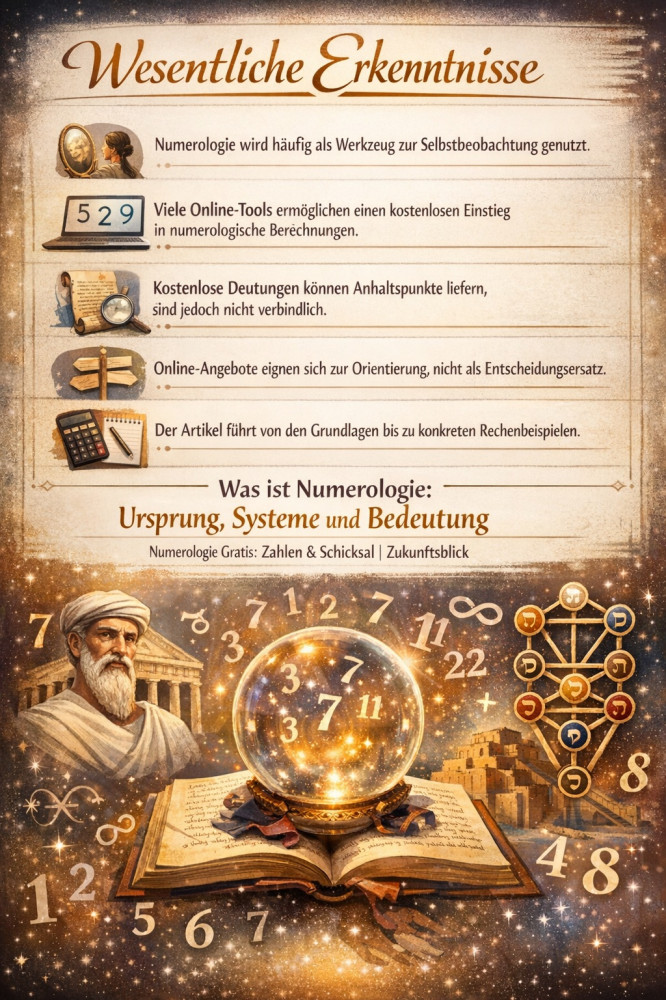 Gratis Numerologie bietet einen niedrigschwelligen Einstieg in die symbolische Arbeit mit Zahlen. Geburtszahl, Lebenszahl und Schicksalszahl lassen sich einfach berechnen und geben Anhaltspunkte für persönliche Themen und Denkansätze.