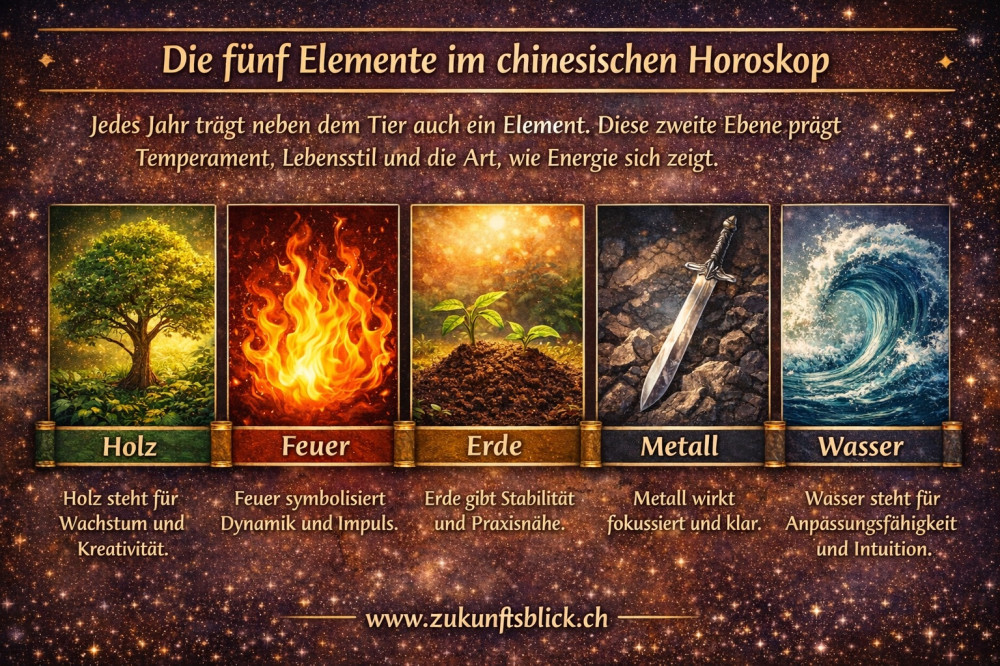 Holz, Feuer, Erde, Metall und Wasser ergänzen das Tierzeichen und geben zusätzliche Nuancen. Zusammen mit Yin/Yang entsteht ein 60-Jahres-Zyklus, der Temperament, Dynamik und Zeitqualität feiner beschreibt.